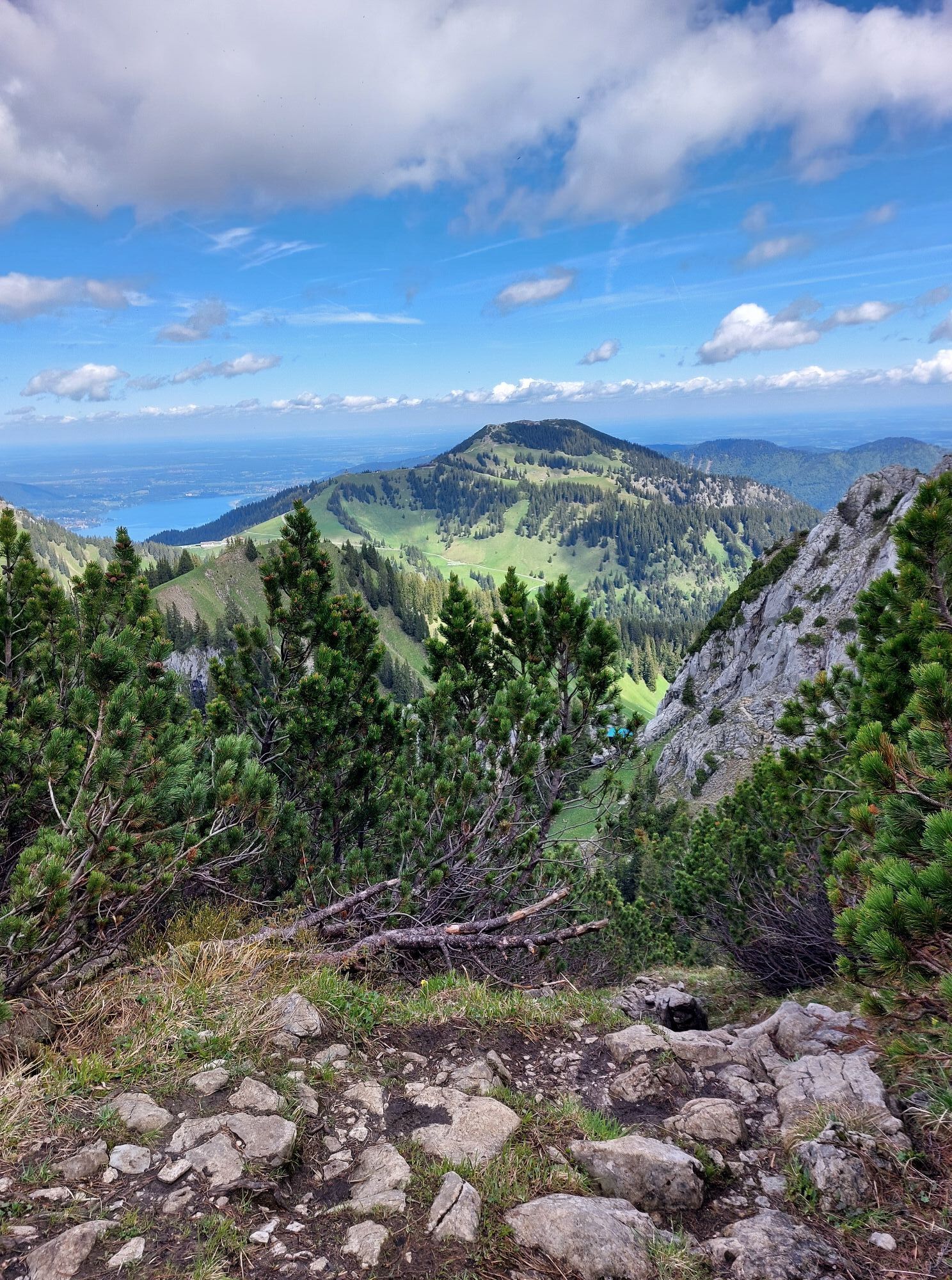 Nach einer gemütlichen Gipfelbrotzeit geht es auf dem Steig an der Ostseite des Risserkogels wieder hinunter. Hier ist große Vorsicht geboten. Selbst bei trockenem Wetter sollte hier jeder Schritt gut und sicher gesetzt werden. Die Felsen sind zum Teil rutschig und es geht steil bergab (bei Regen am Vortag oder feuchter Witterung empfiehlt es sich die Tour in der anderen Richtung zu gehen und an der Ostseite aufzusteigen). Nach dem steilen Steig macht der Weg eine Biegung nach links (Norden) und wir steigen ein Stück Richtung Riederecksee hinab. Danach halten wir uns rechts und laufen leicht bergab entlang der Flanke des Risserkogels.