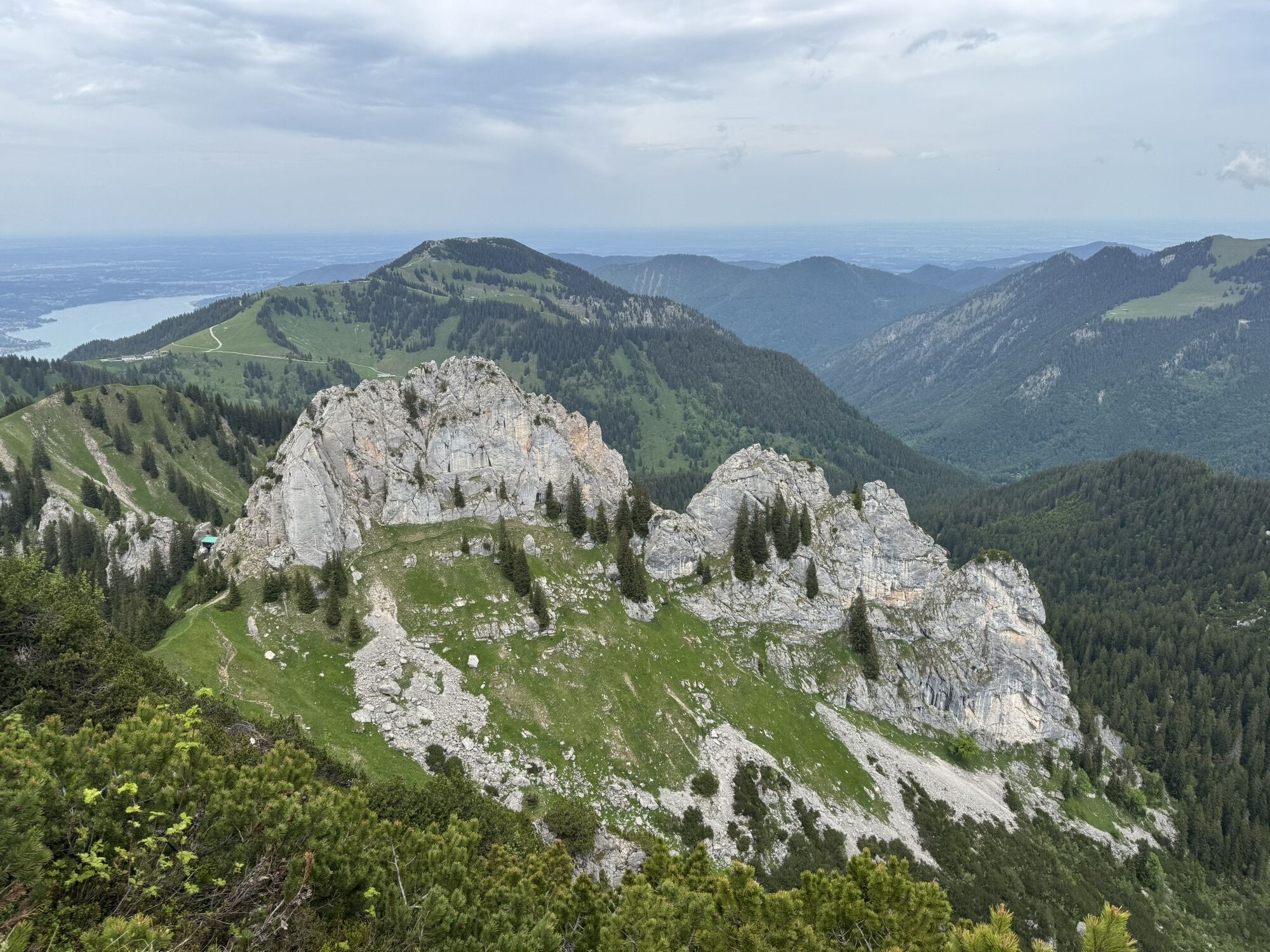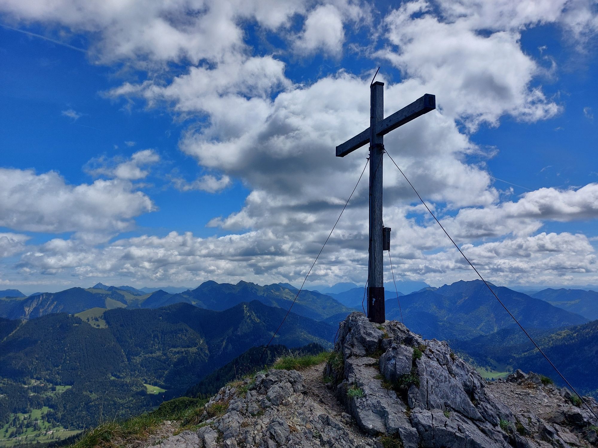 Der Weg wird etwas steiler und nach einiger Zeit kommt die Westseite des Blankestein mit der Bergwachthütte in Sicht. Auf dem Sattel zwischen Blankenstein und Risserkogel haben wir einen schönen Ausblick hinunter zum Riederecksee und auf die große vorderste Wand des Blankensteins. Nach ein paar Metern treffen wir auf ein Teilstück der Via-Alpina (Kreuth-Sutten) und biegen in diese nach links zum Gipfel ab. Jetzt geht auf einem Steig das letzte Stück zwischen Latschenkiefern hindurch, steil bergauf bis wir den Gipfel des Risserkogels erreicht haben. Dort werden wir mit einer schönen 360° Aussicht bis weit in die Hauptalpen belohnt.