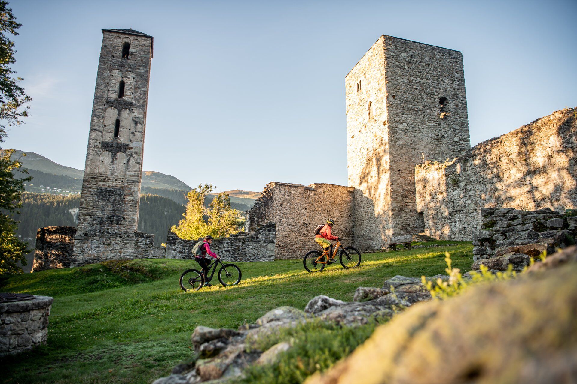 At the start, warm up gently from Brigels through the cool forest of "Fontauna Freida", which means "cold spring". You'll conveniently take a first short single trail along the way. And now you speed through the village of Waltensburg with its charming wooden houses and soon turn towards Munt Sogn Gieri. The beautifully situated castle ruin is definitely worth a detour of 100 meters. Fun and relatively easy, a wide trail now leads down to Rueun. The entertaining continuation over gravel paths and short trails takes you to the town of Ilanz. Here you can refresh yourself and pedal through the old walls of the old town.
