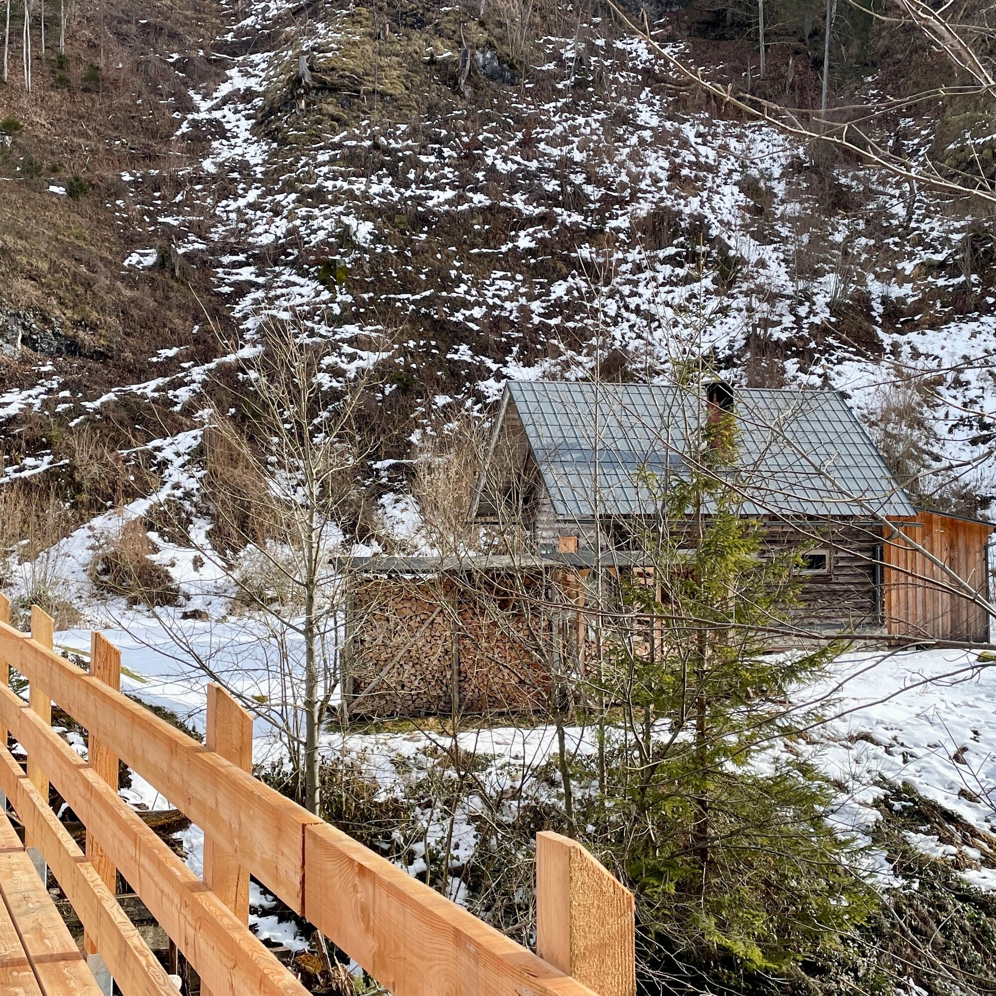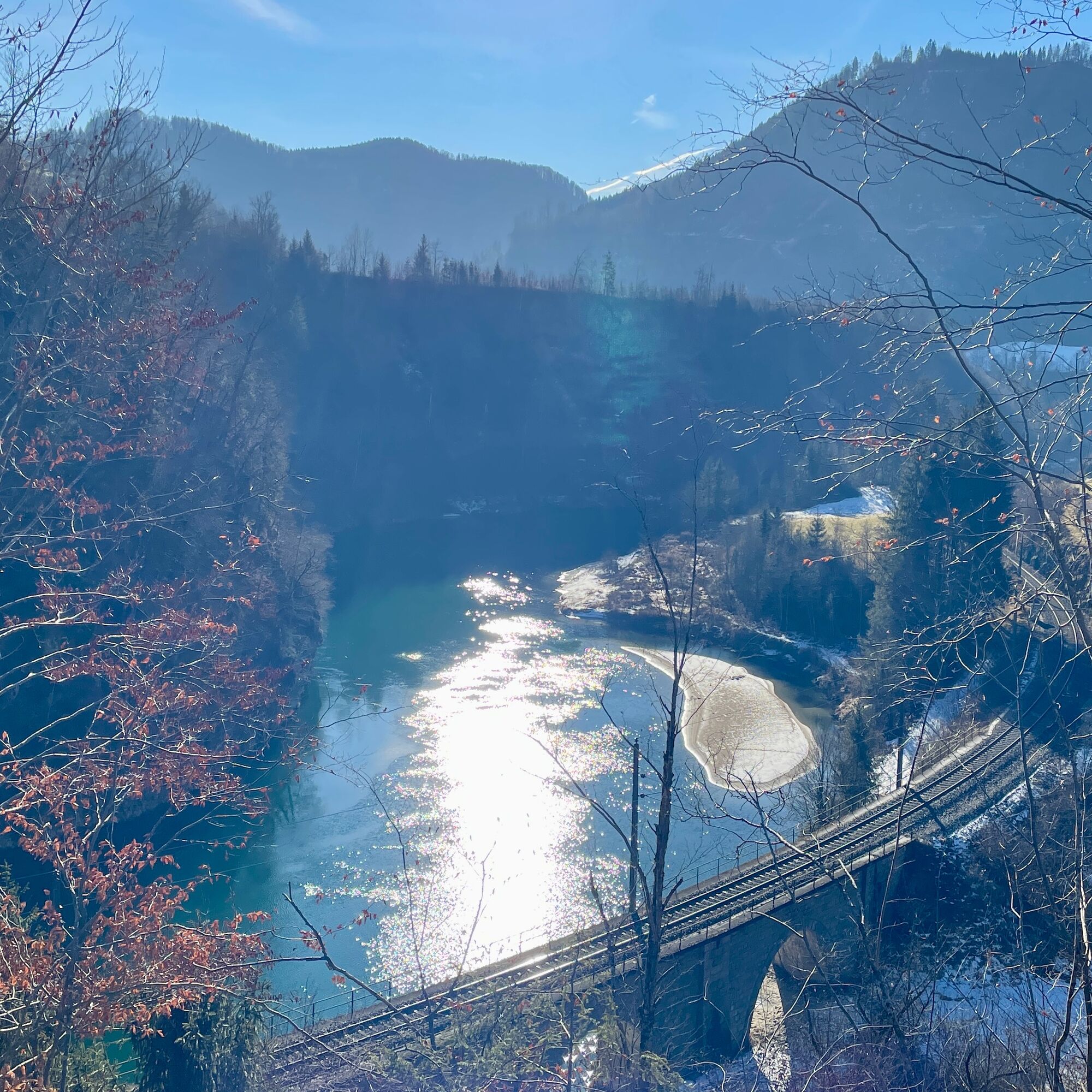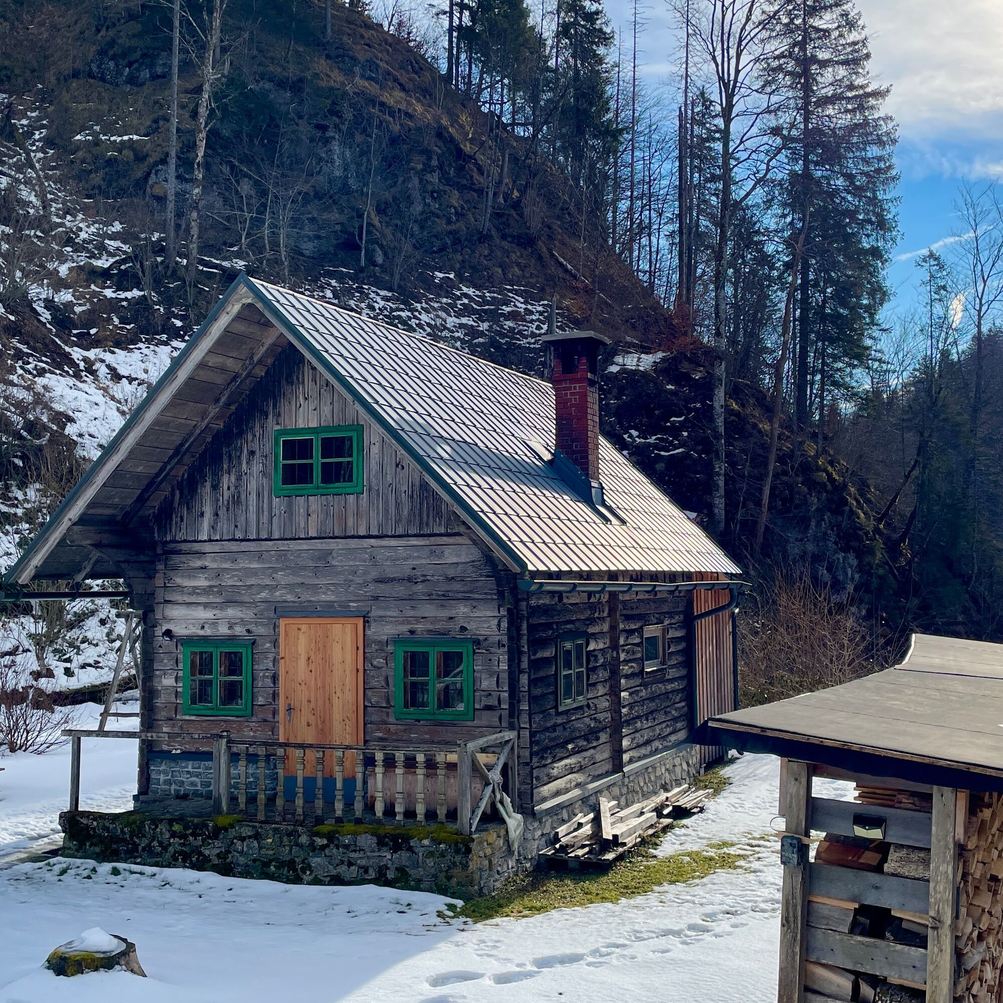 We start the tour at the Schönau bus stop, alternatively there is also parking down by the bridge over the Enns river.After the bridge, we walk along the Schönau main road, past the (former ?!) Jagahansl snack station until we come to some houses in Schönau an der Enns, from here we continue on gravel forest roads. At first we walk flat along the Schleifenbach and then continue to climb until we reach the Schleifenbach Klause after 4.5 km. A newly built wooden bridge leads over the hermitage to a small hut next to the Borsee lake. We continue left along the lake, past the wild meadow to the Kogleralm. Here we leave the forest road and climb up a path in the forest for the next 1.5 km. We continue on very well-maintained forest roads until we reach the highest point of our loop at km 10.5. A small rock to the right of the road marks this point with a wonderful view of the Bodenwies and the nearby Gesäuse. From here it's all downhill, not too steep for the next 8 km along the road. Again and again with a view of the emerald green Enns river, until we reach the Enns bridge again.