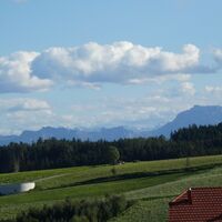 Der sogenannte Kirchensteig führt weiter Richtung Hörbach. Nach Verlassen des Herrnholzes öffnet sich der Blick Richtung Traunstein und Totes Gebirge. Bei klarem Wetter ist auch der 2.515 m hohe Große Priel gut sichtbar.