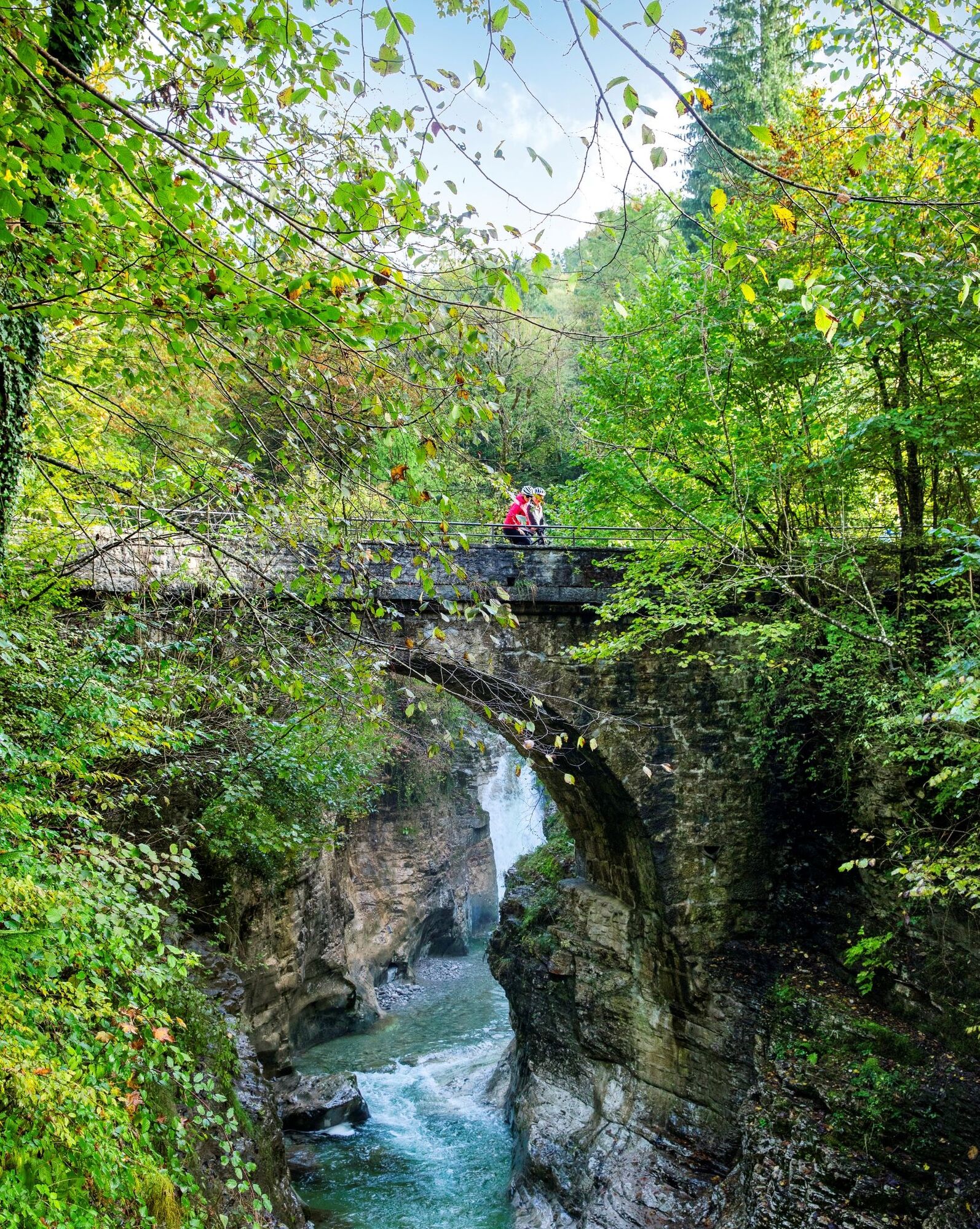 In good weather, a short (or longer) break by the water should be planned. We cycle under the road bridge and over the natural monument Roman Bridge, then turn right at the junction onto this busier road. After about 1 km, we reach the junction at Englhartgut; the right road leads to the Bad Vigaun thermal spa, the Naturthek, and the Schmiedbauer farm dairy. We keep left and pass through the town center of Bad Vigaun.