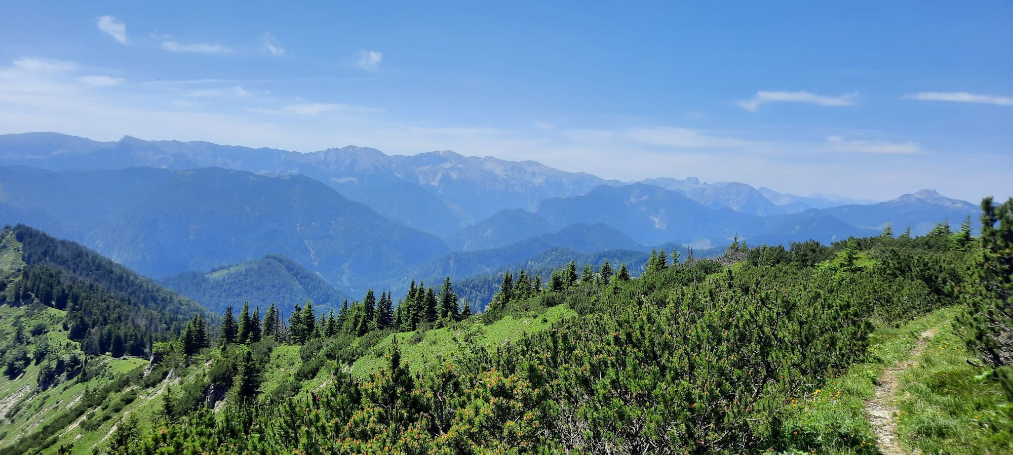 Weiter geht es am Kamm entlang hoch Richtung Mittlerer (1.589m) und Großer Zellerhut teilweise durch Latschen bzw. über Wiesenflächen. Mit einigen Auf- und Abs und am Schlussanstieg durch Latschengassen zum Gipfel des Großen Hutes zu gelangen (gesamt rd.5,3km auf rd.1.639m). Beim Gipfelkreuz genießen wir die Rundumsicht so ferne das Wetter passt und machen eine Pause.
