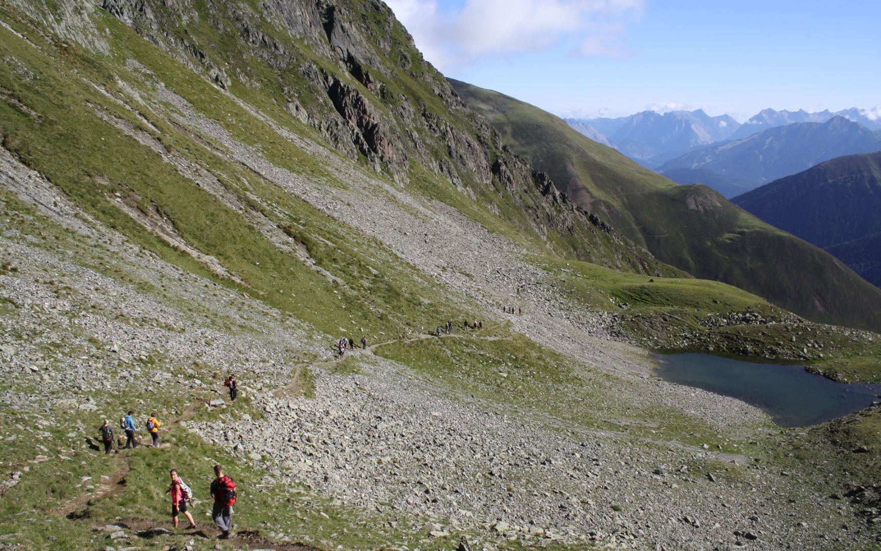 Der Oberhofer Höhenweg führt vom Sellraintal ins Inntal. Zwei Startpunkte sind möglich: Die Zirmbachalm bei Kühtai oder der Parkplatz mit Bushaltestelle zwischen den Lawinengalerien auf der Landesstraße L13. Sie wandern über einen schmalen Steig zur Flaurlinger Scharte auf 2.400 Metern. Auf der Inntalseite geht es bis zur Oberhofer Melkalm auf knapp 1.700 Metern Seehöhe. Hier haben Sie einen herrlichen Blick ins Tal. Achten Sie aber auf die Zeit, denn es gibt keine Übernachtungsmöglichkeit. Von der Oberhofer Melkalm folgt der Abstieg in den Ort Oberhofen.